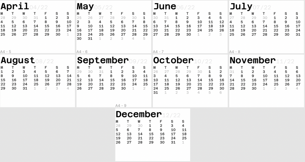 Calendars - April 2022 to December 2022
